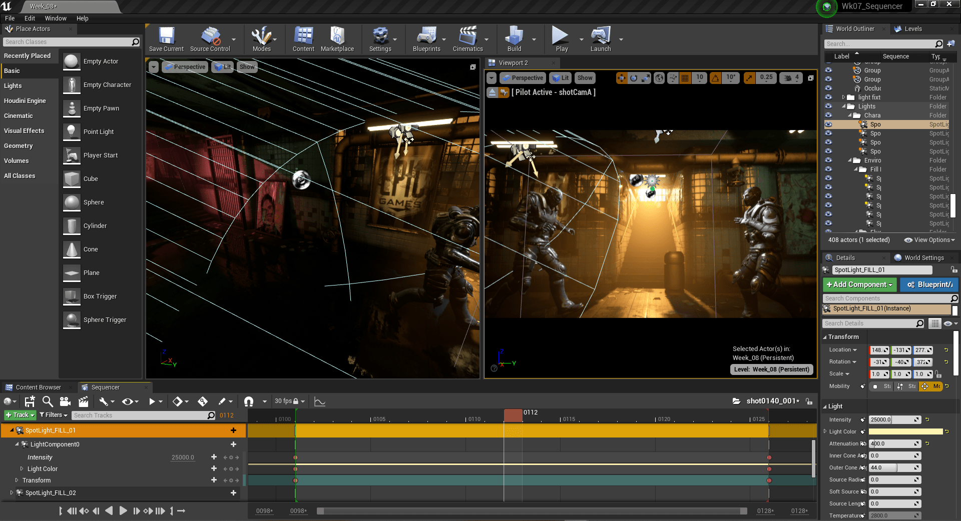 After I am happy with the environment lighting in my map, I will then go into the Sequencer folder to go to each scene and work in the lighting sections. I can focus on each scene’s lights and make sure it is matching the rest of the environment. Sometimes certain scenes will get their own enhanced lighting intensity and directions. There was much testing involved.